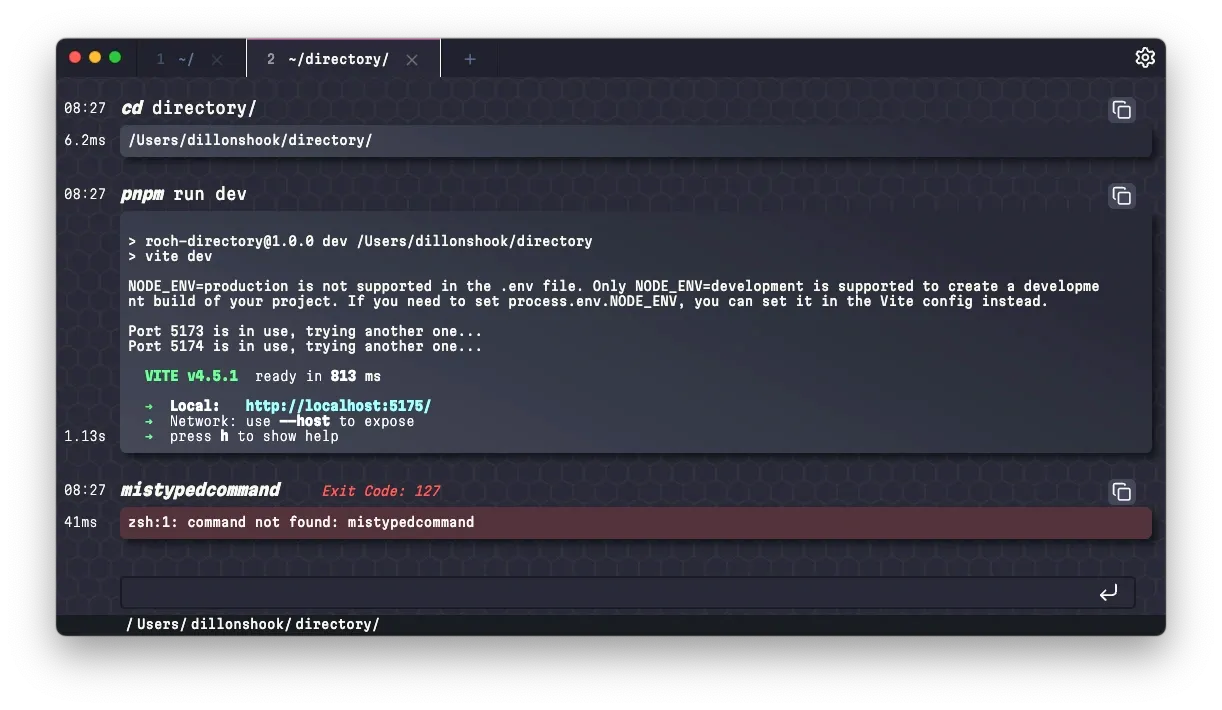 At this point I start searching to survey what the options are. I find a bunch of different options but they all seem focused on different features that don’t change the core terminal experience. Except for one I find mentioned in a reddit thread: Upterm. Now this was actually close to what I’m thinking with it’s autocomplete, prettification of JSON outputs, and showing failed commands in a different color. But very prominently shown on the github page is the banner showing the project has been archived since 2019 since it’s developer tragically passed away. With the nearly 20k stars as validation there’s demand and nothing I can find doing what I want I’m gung ho to get started and own the category before someone else comes along and works on this awesome idea.